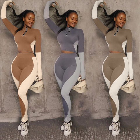 Ensemble de 2 pièces pantalon de Yoga pour femmes, tenue grande taille, manches longues, Fitness, entraînement, vêtements actifs, couleur marron